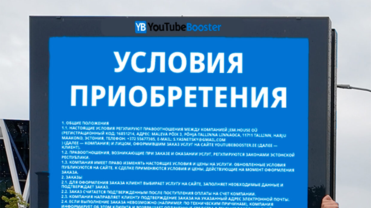 1.1. Настоящие условия регулируют правоотношения между компанией JEM.HOUSE OÜ (регистрационный код: 16851214, адрес: Maleva põik 3, Põhja-Tallinna linnaosa, 11711 Tallinn, Harju maakond, Эстония, телефон: +372 55677305, e-mail: s.yasnetsky@gmail.com) (далее — Компания) и лицом, оформившим заказ услуг на сайте youtubebooster.ee (далее — Клиент).